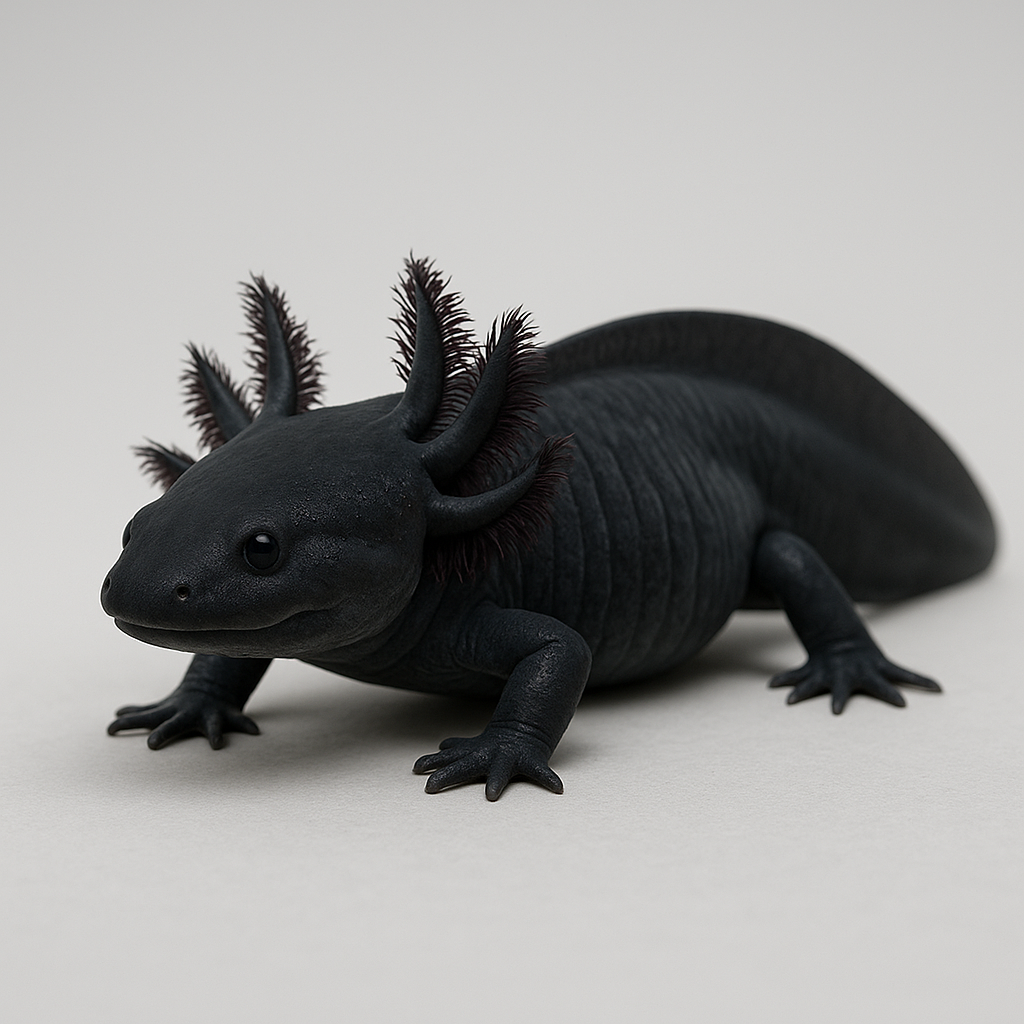 The Melanoid axolotl is known for its deep, velvety black coloration and uniform pigment from head to tail. Unlike wild-type axolotls, melanoids lack iridophores (shiny pigments), giving them a rich, matte appearance with solid black eyes and dark, feathery gills. In some lighting, subtle shades of deep blue or purple may appear along their body.